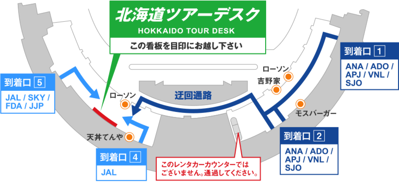 新千歳空港にご到着後、お手荷物を受け取られましたら、到着ロビー1F、JAL【到着口4】と【到着口5】の間にございます【北海道ツアーデスク】までご来店ください。